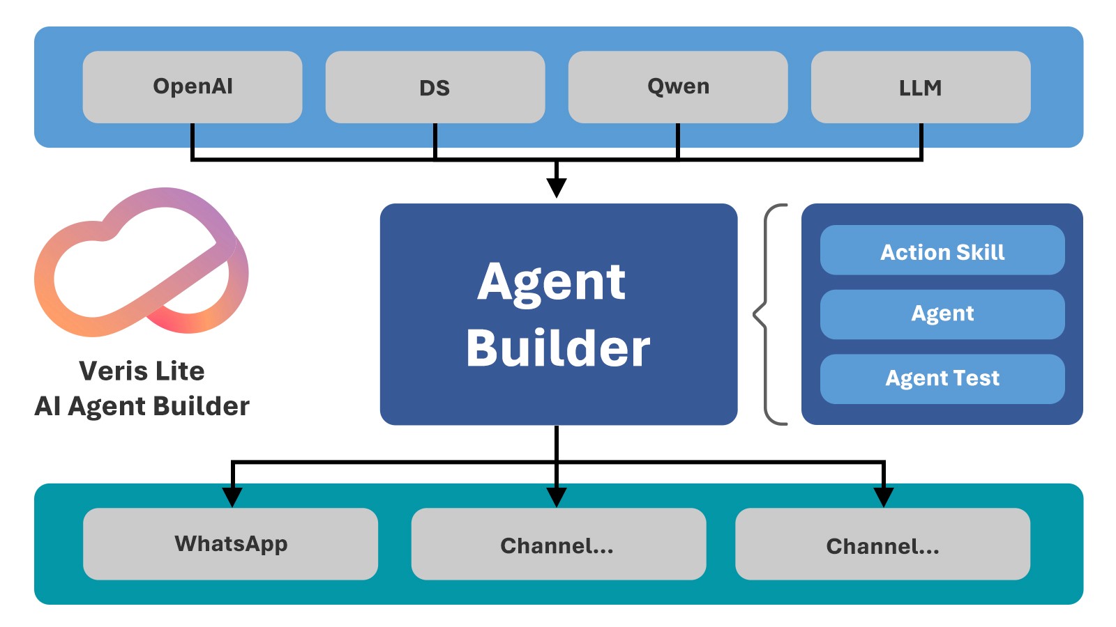 Veris Lite’s layered architecture connects to any LLM (e.g. OpenAI, Qwen) on the back-end and to any customer channel (web, app, WhatsApp, etc.) on the front-end. Inside the Agent Builder, developers define Actions, combine them into Skills, and orchestrate full Agents, with integrated testing tools to ensure quality.