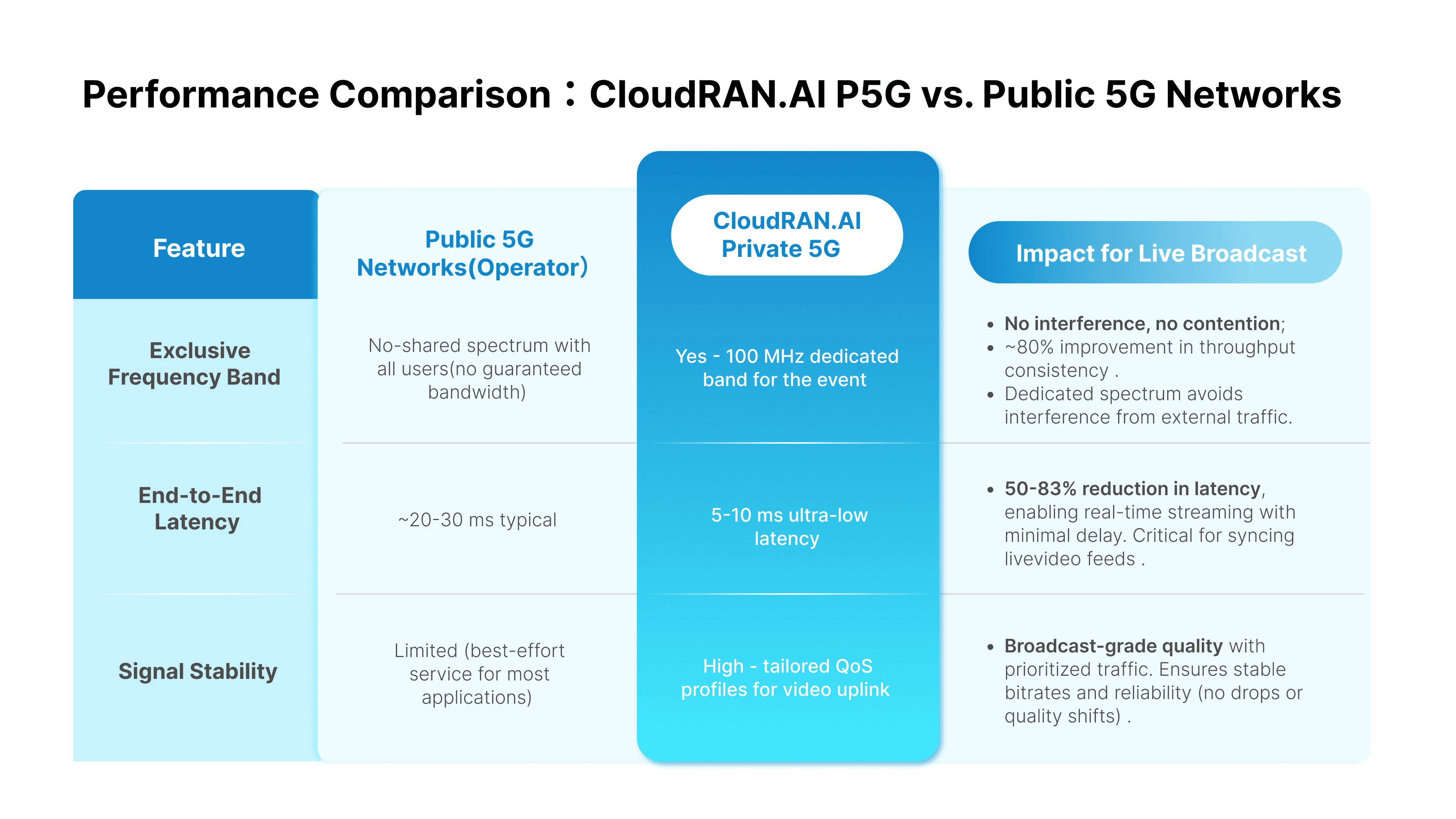 In essence, CloudRAN.AI’s P5G provides a private “fast lane” for live broadcasts, whereas public 5G is a shared highway. At crowded events, a public network might struggle as thousands of phones compete for the same spectrum (and operators usually optimize for download to those users, not uplink).
