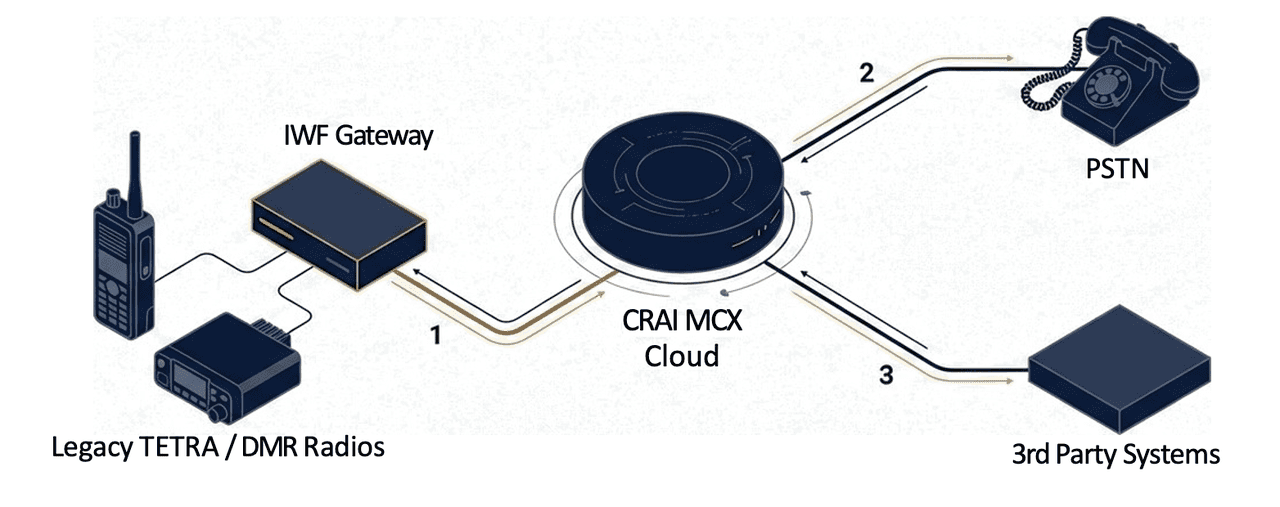 CloudRAN.AI Integrated MCX includes interoperability options through an Interworking Function (IWF) gateway, supporting integration with legacy and third-party systems such as TETRA/DMR, PSTN, and other operational communication platforms.