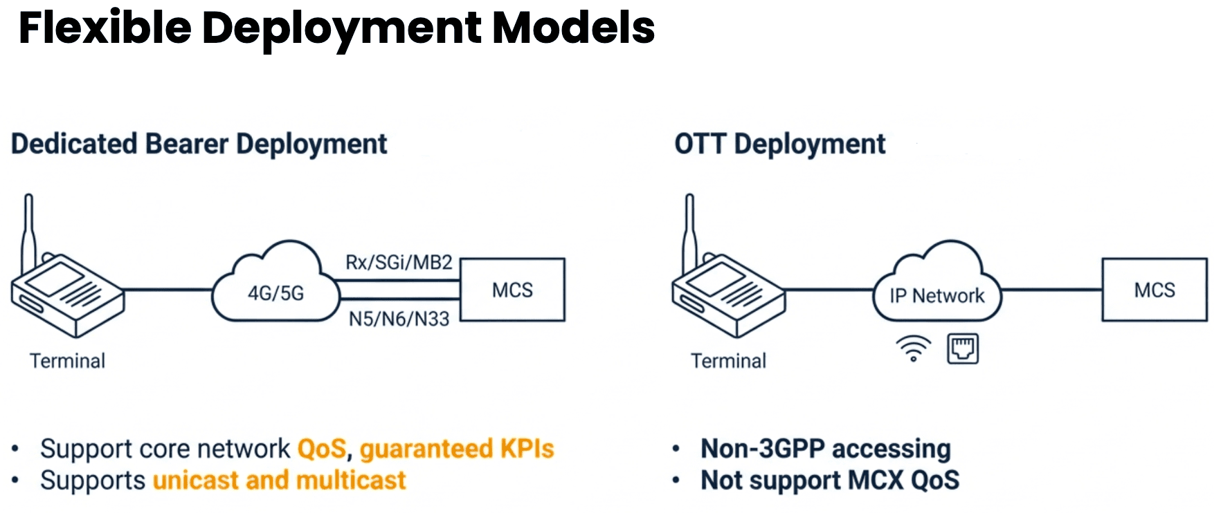 OTT Deployment: faster rollout as an application layer over an existing Private 5G network (no MCX QoS guarantee)