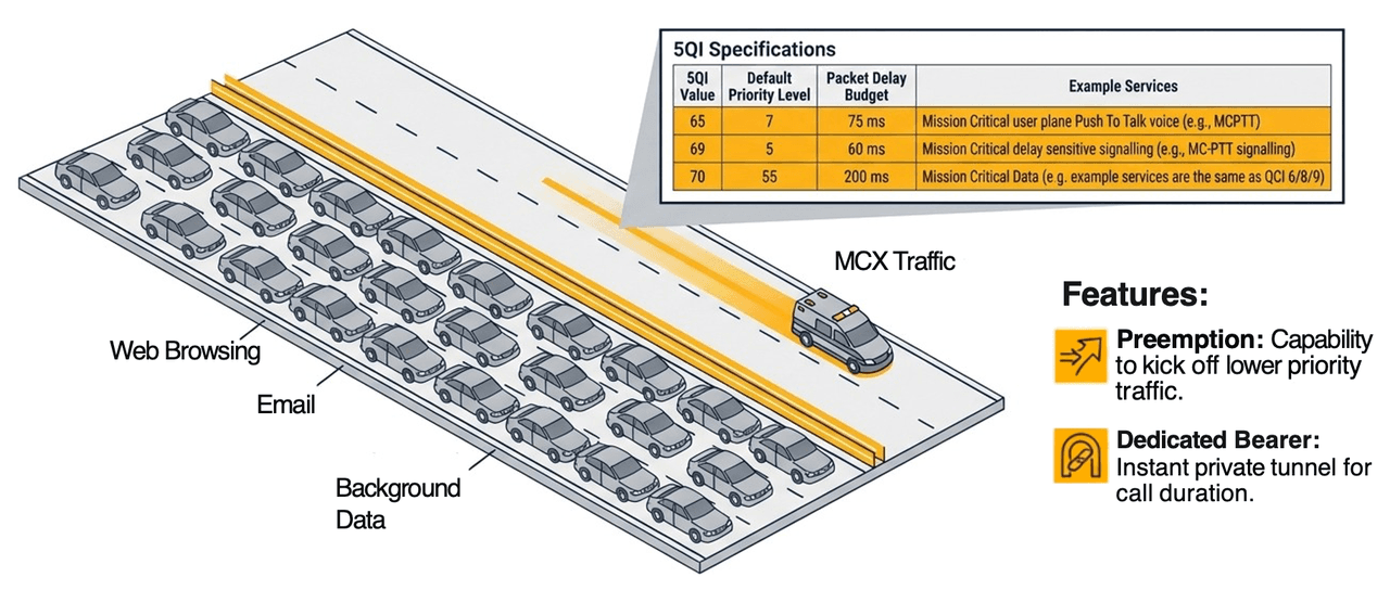 In plain language: when the network is busy, mission-critical communications don’t compete with background traffic — they take priority by design.